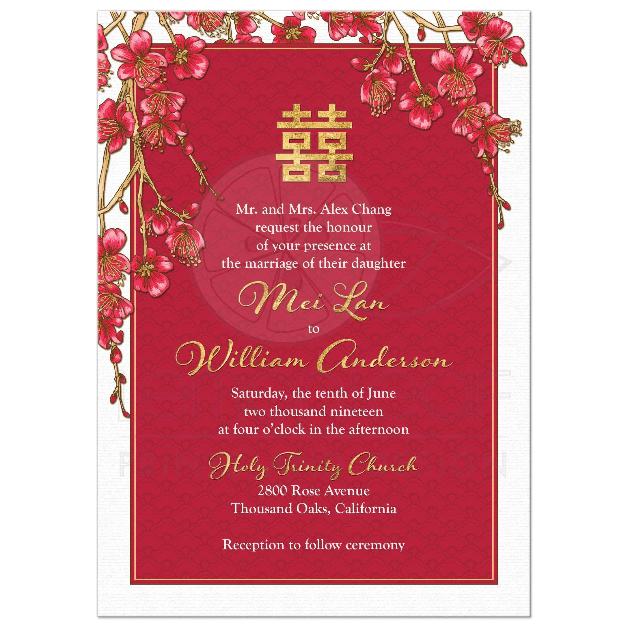 red sakura cherry blossoms flowers chinese wedding from Cherry Blossom Chinese Wedding Invitation Card Template Vector