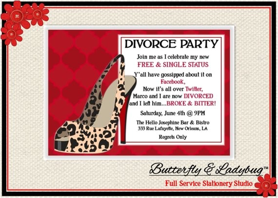 cheetah stiletto high heel divorce birthday bachelorette from divorce party invite wording