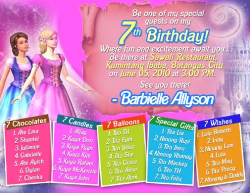 sample invitation barbie design template for seventh from Example Of Invitation Card For 7Th Birthday
