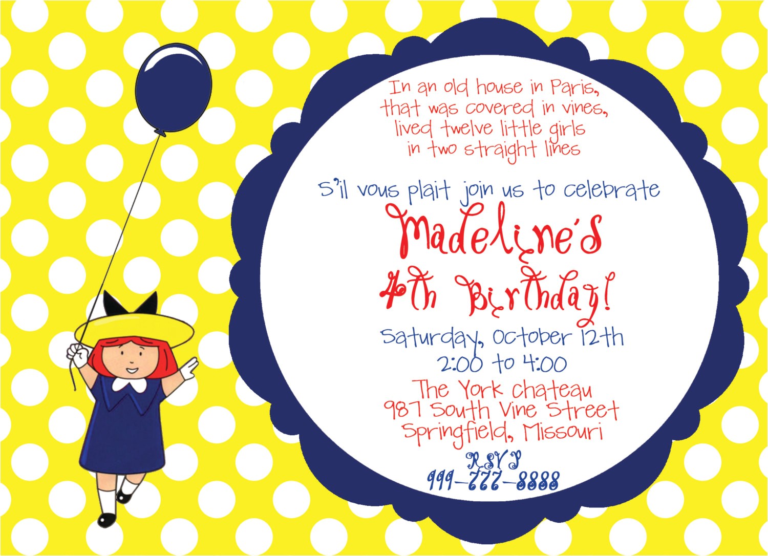 madeline birthday party invitations sample: