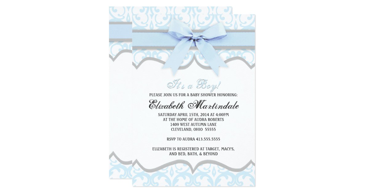 Damask Heart Blue Ribbon Baby Shower Invitation from baby shower invitations with ribbon