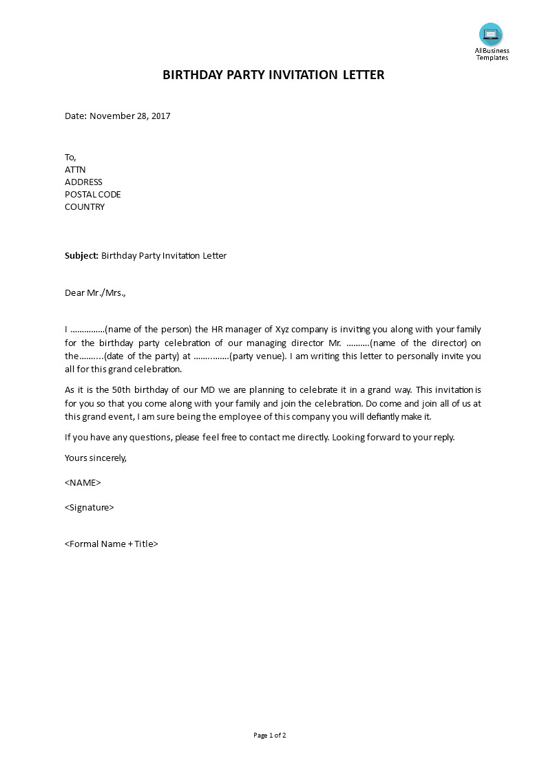 birthday party invitation letter template invitation from Birthday Party Invitation Letter Template