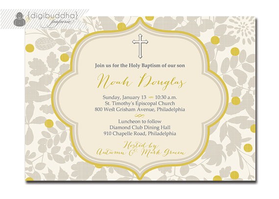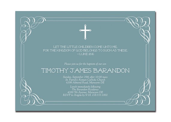 Finally, as to the third question, the invitations should look personal, informal, and patently child-like. Infant baptisms dependence not be any more formal than a homemade collage of baby pictures past glitter and stickers pasted not far off from it. That’s an analogy, of course, but infant baptisms are the least formal of every popular celebrations. They’re much less formal than a Christening and hardly even worth sending out invites for. Everyone at your church will already be there, of course. However, if you’re hosting the issue elsewhere, it’s necessary that the clergy, church members, friends, and associates every get invites. There’s just no reason not to. Afterward, you can every go out and have lunch as a pretentiousness of celebrating. The invitations should inform people of the following: the baby’s name, a photograph of the baby, and the day, date, time, and area of the infant baptism.