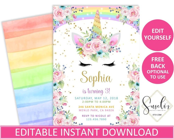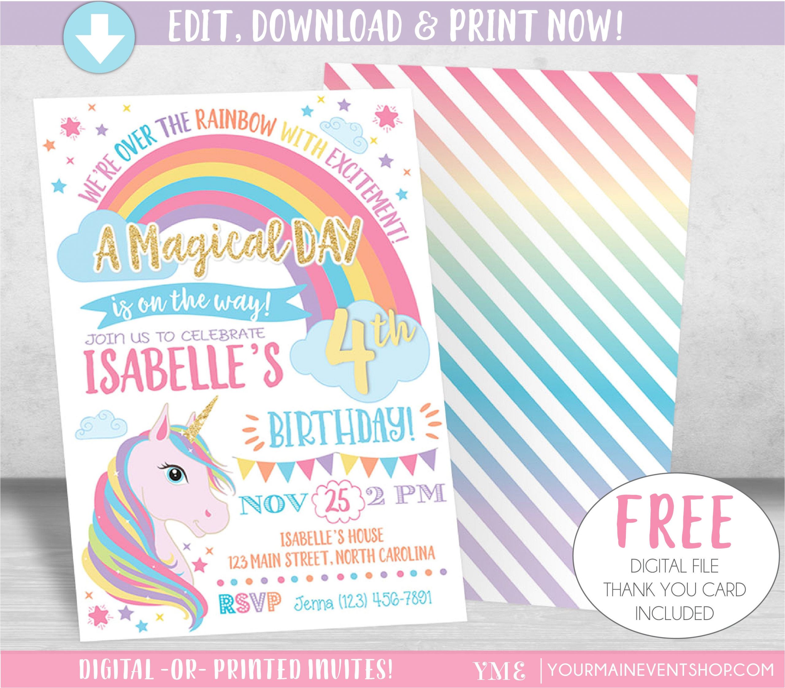 editable unicorn rainbow birthday invite invitations etsy from Etsy Birthday Invitation Template