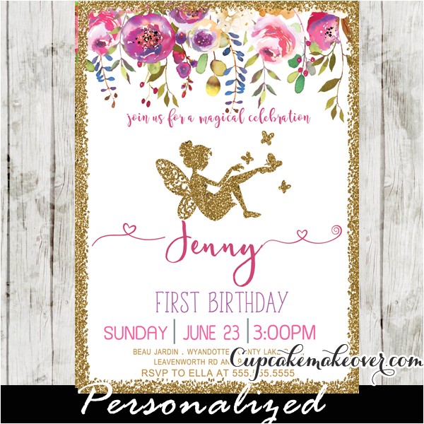 Fairy First Birthday Invitations Pink Floral Gold Glitter from fairy 1st birthday invitations