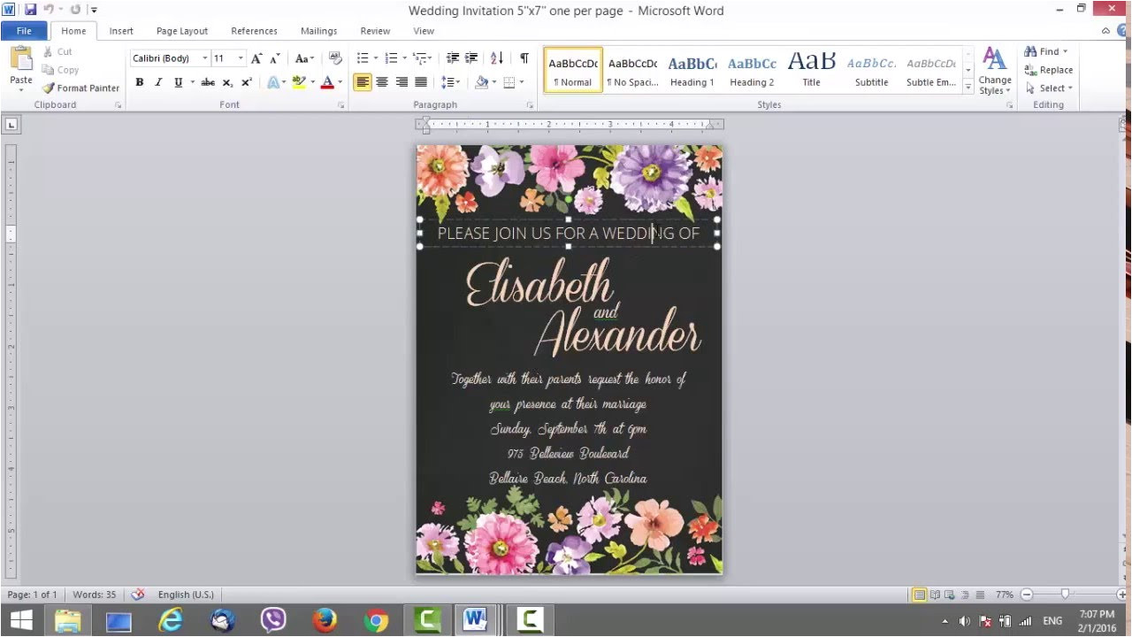 35 free wedding invitation templates in microsoft word since you included wedding invitations in your wedding package you get some of the monetary portion intended for the invitation production make sure that the budget you enclosed is manageable to the overall number of attendees and other editing and production expenses carefully plan the division of money take what s necessary your budget tells you the extent of your production and the usage of your resources and the proper dealing with expenses how to make wedding invitations in microsoft word how to make wedding invitations in microsoft word video tutorial showing how to use the deco flower invitation template from download print to make custom invitations in microsoft word at how to make invitations on microsoft word 10 steps if you re hosting a get togethers a small celebration at home or a birthday party you might want to send informal invitations to your friends and family this type of invitation can be done right in microsoft word it provides you the option to create customized invitations using a large variety of layout tools and templates and then you can just print it out not only will you save money on these invitations but it ll have your personal touch how to create an invitation in word 10 best examples to make sure your friends or loved ones can make it to your party use this simple get together party invitation template the sleek marble background will surely impress your guests and will surely exude the formal or stylish vibes of the event this template is available in adobe illustrator and photoshop ms word and publisher and apple pages format how to edit a wedding invitation template in word tricia a heagle owner of t aletta will show you how to edit a t aletta wedding invitation template in word open up the file in word or pages and begin to add your wedding details in the text wedding invitation template for ms word these printable wedding invitation templates are an easy to edit and inexpensive alternative to pricey invitations link to wedding invitation template http how to make an invitation in microsoft word diy wedding invitations ms word office do it yourself invitation tutorial subscribe to our channel to keep up to date with our videos click to see more invitations templates office com complete the provided fields on the invitation template to add your own message and change the colors to match the theme of your event easily print your invitations on your favorite paper or cardstock seal them in envelopes and pop them in the mail with dozens of free invitation templates to choose from you will easily impress your friends and family while reminding them to save the date for your special event tutorial of making an invitation card in microsoft publisher microsoft word tutorial how to make wedding invitation cards in ms how to customize an invitation template in microsoft word duration 4 28 downloadandprint 52 416 views 4 28 how to diy