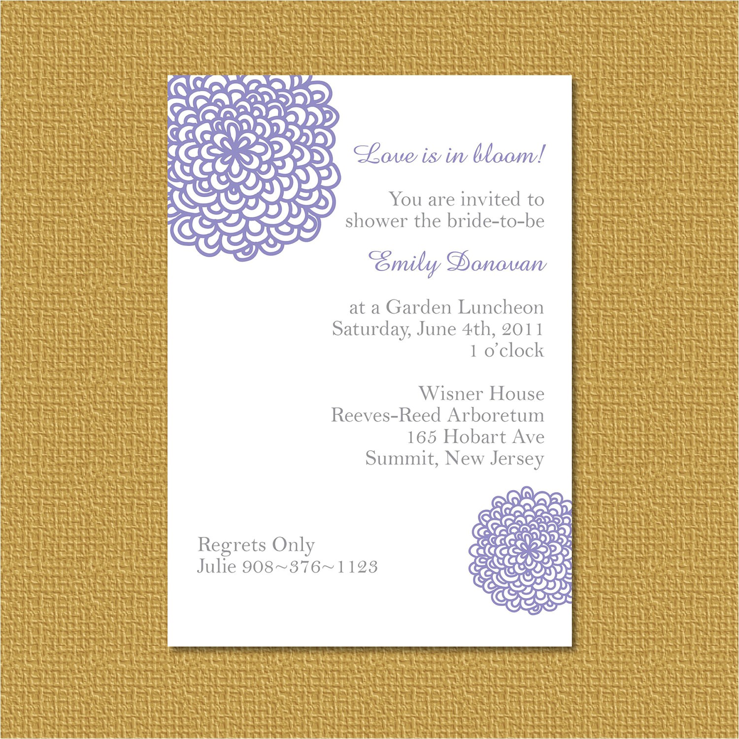 Bridal shower invitations should not solitary invite your guests to the event, they should contain positive instructions upon the location of the shower, any theme that is physical used for the shower and an RSVP card that can back up you determine the amount of guests you can expect. Including a self addressed stamped envelope inside the invitation hence that your guests can return the RSVP easily is also recommended.