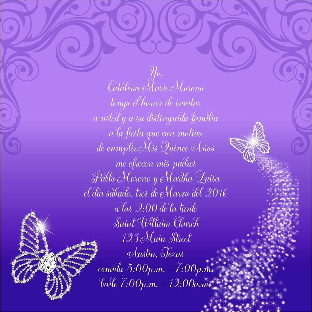 El Sr. Jorge Rojas y Maria Rojas tienen el honor de invitarlo a Usted y a su Apreciable familia a la celebracion de los Quince Años de su hija, Carla Rojas.
