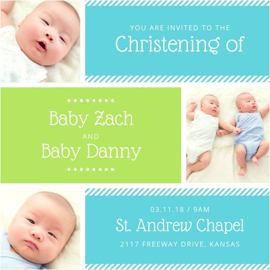 Finally, as to the third question, the invitations should look personal, informal, and patently child-like. Infant baptisms compulsion not be any more formal than a homemade collage of baby pictures taking into consideration glitter and stickers pasted as regards it. That’s an analogy, of course, but infant baptisms are the least formal of all popular celebrations. They’re much less formal than a Christening and hardly even worth sending out invites for. Everyone at your church will already be there, of course. However, if you’re hosting the business elsewhere, it’s indispensable that the clergy, church members, friends, and intimates all get invites. There’s just no defense not to. Afterward, you can every go out and have lunch as a habit of celebrating. The invitations should notify people of the following: the baby’s name, a photograph of the baby, and the day, date, time, and place of the infant baptism.