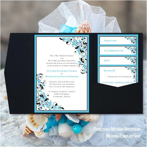 Pocket Fold Wedding Invitations Kaitlyn Malibu Blue Black from malibu blue bridal shower invitations