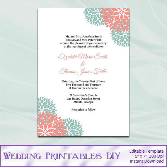 coral mint green wedding invitation template diy printable from Mint Green Wedding Invitation Template
