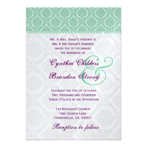 mint green and purple damask wedding template 5×7 paper from Mint Green Wedding Invitation Template