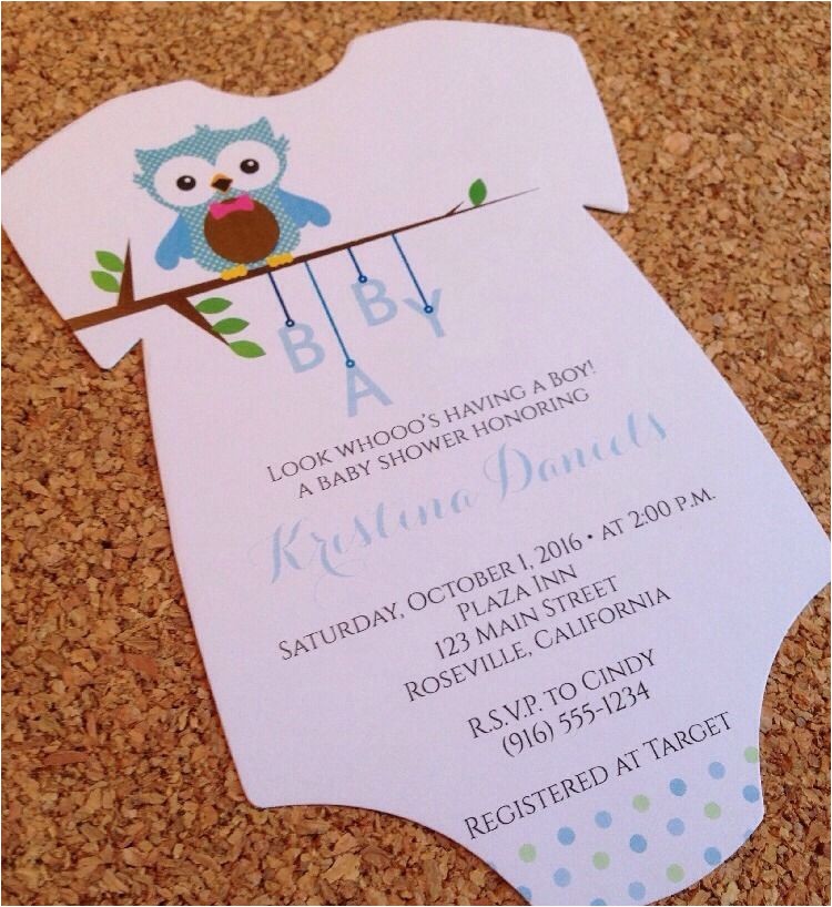 Baby Shower Invitation esie with Baby Boy Owl from onesie baby shower invitations for baby boy