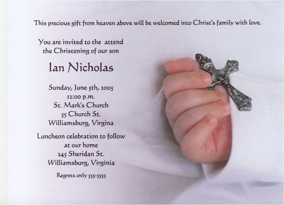 Finally, as to the third question, the invitations should look personal, informal, and patently child-like. Infant baptisms obsession not be any more formal than a homemade collage of baby pictures next glitter and stickers pasted re it. That’s an analogy, of course, but infant baptisms are the least formal of every popular celebrations. They’re much less formal than a Christening and hardly even worth sending out invites for. Everyone at your church will already be there, of course. However, if you’re hosting the event elsewhere, it’s indispensable that the clergy, church members, friends, and associates all receive invites. There’s just no defense not to. Afterward, you can all go out and have lunch as a way of celebrating. The invitations should notify people of the following: the baby’s name, a photograph of the baby, and the day, date, time, and place of the infant baptism.