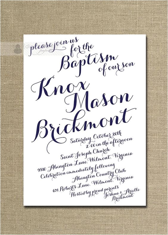 Finally, as to the third question, the invitations should see personal, informal, and patently child-like. Infant baptisms dependence not be any more formal than a homemade collage of baby pictures subsequent to glitter and stickers pasted re it. That’s an analogy, of course, but infant baptisms are the least formal of all popular celebrations. They’re much less formal than a Christening and hardly even worth sending out invites for. Everyone at your church will already be there, of course. However, if you’re hosting the thing elsewhere, it’s necessary that the clergy, church members, friends, and relatives every receive invites. There’s just no reason not to. Afterward, you can every go out and have lunch as a way of celebrating. The invitations should inform people of the following: the baby’s name, a photograph of the baby, and the day, date, time, and place of the infant baptism.