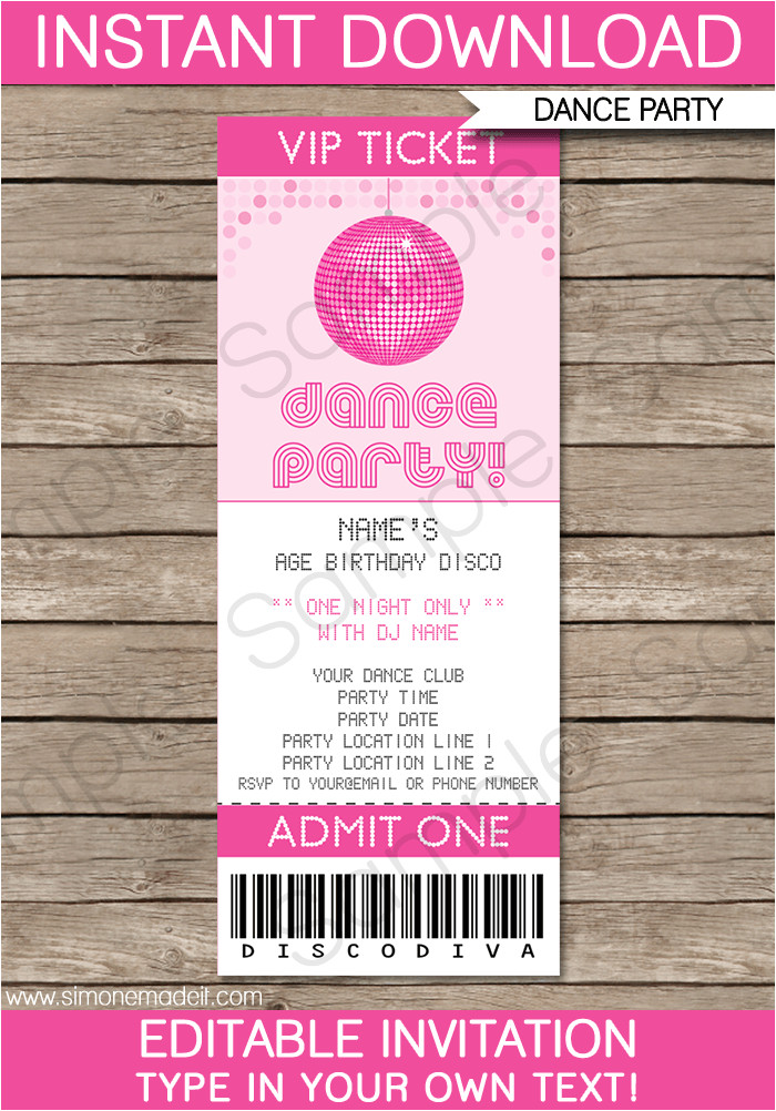 dance party ticket invitations template pink birthday from Party Invitation Ticket Template