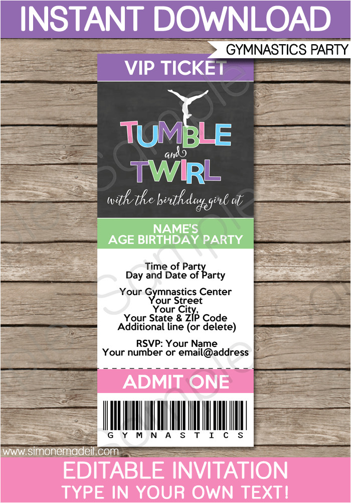gymnastics party ticket invitations printable