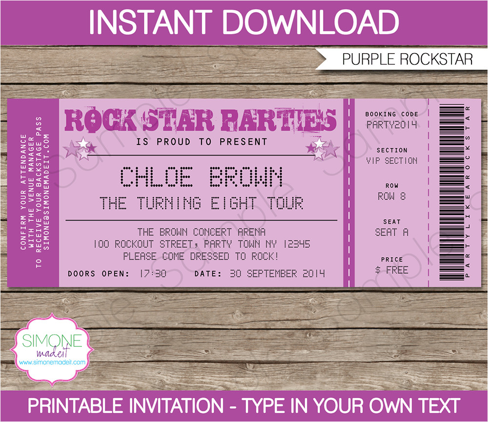rockstar party ticket invitations purple birthday