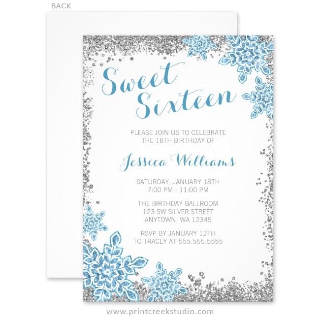 sweet 16 glam winter wonderland silver blue invitations from snowflake birthday party invitations