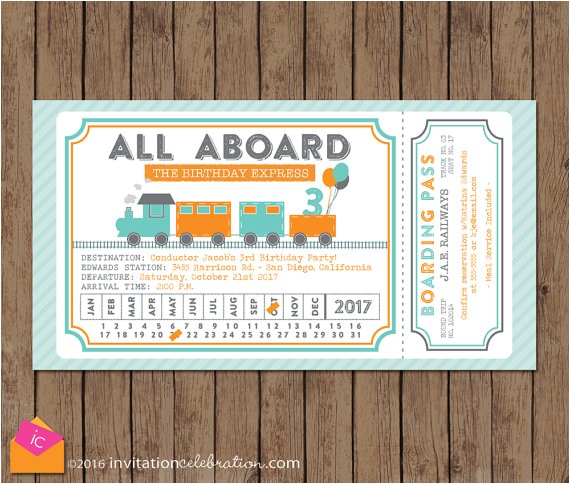 Train Ticket Invitation All Aboard Turquoise Orange Gray from train tickets birthday invitations