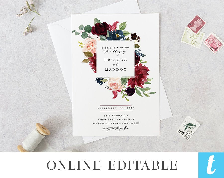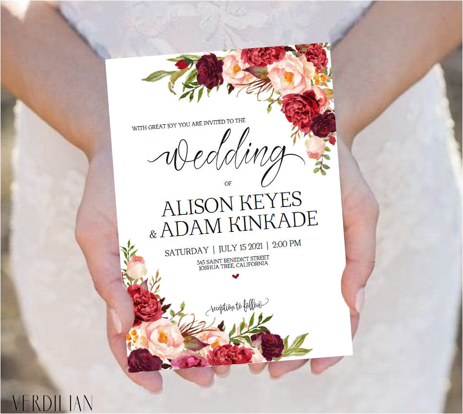 burgundy wedding invitation template printable wedding etsy from Wedding Invitation Template Burgundy